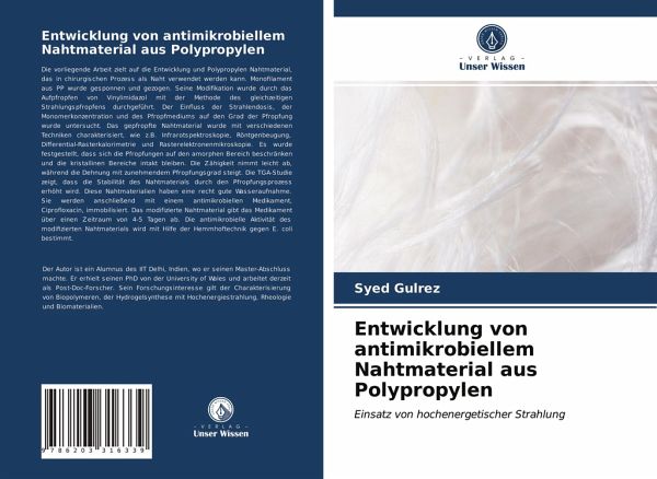 Die vorliegende Arbeit zielt auf die Entwicklung und Polypropylen Nahtmaterial, das in chirurgischen Prozess als Naht verwendet werden kann. Monofilament aus PP wurde gesponnen und gezogen. Seine Modifikation wurde durch das Aufpfropfen von Vinylimidazol mit der Methode des gleichzeitigen Strahlungspfropfens durchgeführt. Der Einfluss der Strahlendosis, der Monomerkonzentration und des Pfropfmediums auf den Grad der Pfropfung wurde untersucht. Das gepfropfte Nahtmaterial wurde mit verschiedenen Techniken charakterisiert, wie z.B. Infrarotspektroskopie, Röntgenbeugung, Differential-Rasterkalorimetrie und Rasterelektronenmikroskopie. Es wurde festgestellt, dass sich die Pfropfungen auf den amorphen Bereich beschränken und die kristallinen Bereiche intakt bleiben. Die Zähigkeit nimmt leicht ab, während die Dehnung mit zunehmendem Pfropfungsgrad steigt. Die TGA-Studie zeigt, dass die Stabilität des Nahtmaterials durch den Pfropfungsprozess erhöht wird. Diese Nahtmaterialien haben eine recht gute Wasseraufnahme. Sie werden anschließend mit einem antimikrobiellen Medikament, Ciprofloxacin, immobilisiert. Das modifizierte Nahtmaterial gibt das Medikament über einen Zeitraum von 4-5 Tagen ab. Die antimikrobielle Aktivität des modifizierten Nahtmaterials wird mit Hilfe der Hemmhoftechnik gegen E. coli bestimmt.