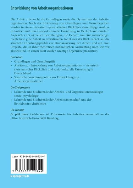 Grundlagen und Grundbegriffe.- Arbeitsorganisationen und ihre Mitglieder.- Entwicklung von Arbeitsorganisationen im Spannungsfeld von Humanisierung der Arbeit und betrieblicher Rationalisierung.- Theoretische und praktische Probleme bei der Entwicklung von Arbeitsorganisationen.- Aktuelle Arbeits- und Managementkonzepte für die Entwicklung von Arbeitsorganisationen.- Ansätze zur Entwicklung von Arbeitsorganisationen - historisch-systematischer Rückblick und sozio-kulturelle Umsetzung in Deutschland.- Wissenschaftliche Betriebsführung.- Human-Relations-Bewegung.- Neue Formen der Arbeitsorganisation.- Neue Produktionskonzepte, Lean Production und Unternehmensnetzwerke.- Staatliche Forschungspolitik zur Entwicklung von Arbeitsorganisationen.- Forschungs- und Aktionsprogramm Humanisierung des Arbeitslebens.- Staatlich geförderte Forschungsvorhaben.- Interview mit Theo Pirker: - Interview mit Else und Werner Fricke.