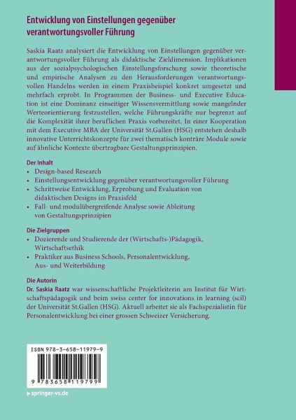 Saskia Raatz analysiert die Entwicklung vonEinstellungen gegenüber verantwortungsvoller Führung als didaktische Zieldimension.Implikationen aus der sozialpsychologischen Einstellungsforschung sowietheoretische und empirische Analysen zu den Herausforderungen verantwortungsvollenHandelns werden in einem Praxisbeispiel konkret umgesetzt und mehrfach erprobt.In Programmen der Business- und Executive Education ist eine Dominanzeinseitiger Wissensvermittlung sowie mangelnder Werteorientierungfestzustellen, welche Führungskräfte nur begrenzt auf die Komplexität ihrerberuflichen Praxis vorbereitet. In einer Kooperation mit dem Executive MBA derUniversität St.Gallen (HSG) entstehen deshalb innovative Unterrichtskonzeptefür zwei thematisch konträre Module sowie auf ähnliche Kontexte übertragbareGestaltungsprinzipien.