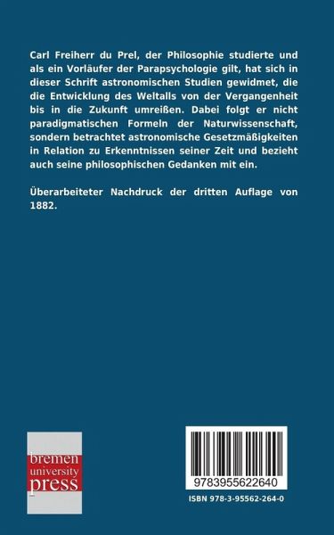 Carl Freiherr du Prel, der Philosophie studierte und als ein Vorläufer der Parapsychologie gilt, hat sich in dieser Schrift astronomischen Studien gewidmet, die die Entwicklung des Weltalls von der Vergangenheit bis in die Zukunft umreißen. Dabei folgt er nicht paradigmatischen Formeln der Naturwissenschaft, sondern betrachtet astronomische Gesetzmäßigkeiten in Relation zu Erkenntnissen seiner Zeit und bezieht auch seine philosophischen Gedanken mit ein.