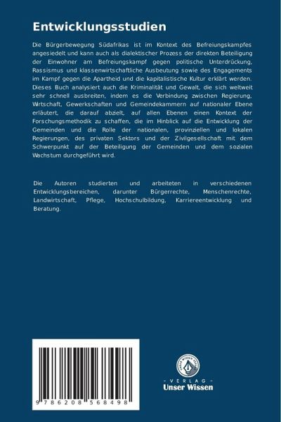 Die Bürgerbewegung Südafrikas ist im Kontext des Befreiungskampfes angesiedelt und kann auch als dialektischer Prozess der direkten Beteiligung der Einwohner am Befreiungskampf gegen politische Unterdrückung, Rassismus und klassenwirtschaftliche Ausbeutung sowie des Engagements im Kampf gegen die Apartheid und die kapitalistische Kultur erklärt werden. Dieses Buch analysiert auch die Kriminalität und Gewalt, die sich weltweit sehr schnell ausbreiten, indem es die Verbindung zwischen Regierung, Wirtschaft, Gewerkschaften und Gemeindekammern auf nationaler Ebene erläutert, die darauf abzielt, auf allen Ebenen einen Kontext der Forschungsmethodik zu schaffen, die im Hinblick auf die Entwicklung der Gemeinden und die Rolle der nationalen, provinziellen und lokalen Regierungen, des privaten Sektors und der Zivilgesellschaft mit dem Schwerpunkt auf der Beteiligung der Gemeinden und dem sozialen Wachstum durchgeführt wird.