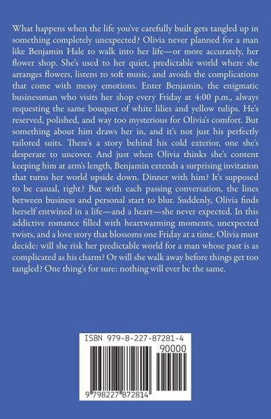 What happens when the life you've carefully built gets tangled up in something completely unexpected? Olivia never planned for a man like Benjamin Hale to walk into her life-or more accurately, her flower shop. She's used to her quiet, predictable world where she arranges flowers, listens to soft music, and avoids the complications that come with messy emotions. Enter Benjamin, the enigmatic businessman who visits her shop every Friday at 4:00 p.m., always requesting the same bouquet of white lilies and yellow tulips. He's reserved, polished, and way too mysterious for Olivia's comfort. But something about him draws her in, and it's not just his perfectly tailored suits. There's a story behind his cold exterior, one she's desperate to uncover. And just when Olivia thinks she's content keeping him at arm's length, Benjamin extends a surprising invitation that turns her world upside down. Dinner with him? It's supposed to be casual, right? But with each passing conversation, the lines between business and personal start to blur. Suddenly, Olivia finds herself entwined in a life-and a heart-she never expected. In this addictive romance filled with heartwarming moments, unexpected twists, and a love story that blossoms one Friday at a time, Olivia must decide: will she risk her predictable world for a man whose past is as complicated as his charm? Or will she walk away before things get too tangled? One thing's for sure: nothing will ever be the same.