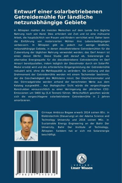 In Äthiopien mahlen die meisten Menschen auf dem Lande ihre tägliche Nahrung noch von Hand. Dies erfordert viel Zeit und ist eine mühsame Arbeit, die hauptsächlich von Frauen und Kindern verrichtet wird. Daher kann die Einführung von motorisierten Mühlen ihre Lebensbedingungen verbessern. In Äthiopien gibt es jedoch nur wenige ländliche, netzunabhängige Gebiete, in denen dieselbetriebene Getreidemühlen für die Zubereitung der täglichen Nahrung verwendet werden; das Dorf Amasri ist eines dieser Dörfer. Diese Studie zielt darauf ab, Solarenergie als alternative Energiequelle für die dieselbetriebene Getreidemühle im Dorf Amasri bereitzustellen, indem lediglich der Dieselmotor durch ein Solar-PV-Modul ersetzt wird und die erforderliche Eingangsleistung der Getreidemühle reduziert wird, ohne die Mahlkapazität zu verändern. Die Leistung und das Drehmoment der Getreidemühle werden mit einem Tachometer bestimmt, der die Geschwindigkeit des Mühlsteins misst. Der Gleichstrommotor und das Stirnradgetriebe werden anhand der berechneten Werte aus dem Katalog ausgewählt... Aus ökologischer Sicht würde die vorgeschlagene Konstruktion voraussichtlich zu einer Verringerung der jährlichen CO2-Emissionen um 5400 kg (5,4 Tonnen) führen. Wirtschaftlich gesehen würde sich die vorgeschlagene solarbetriebene Getreidemühle in 2 Jahren amortisieren.