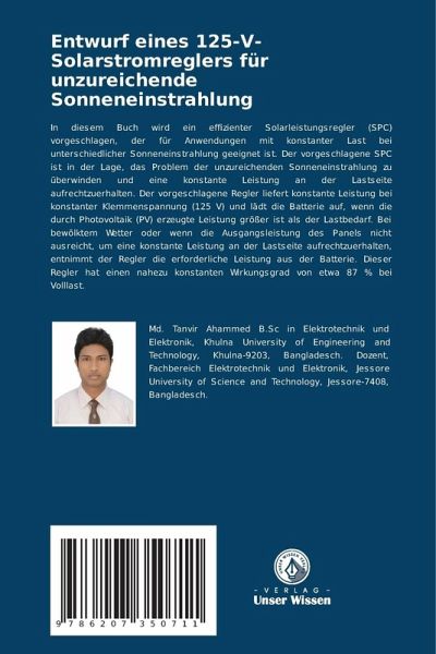 In diesem Buch wird ein effizienter Solarleistungsregler (SPC) vorgeschlagen, der für Anwendungen mit konstanter Last bei unterschiedlicher Sonneneinstrahlung geeignet ist. Der vorgeschlagene SPC ist in der Lage, das Problem der unzureichenden Sonneneinstrahlung zu überwinden und eine konstante Leistung an der Lastseite aufrechtzuerhalten. Der vorgeschlagene Regler liefert konstante Leistung bei konstanter Klemmenspannung (125 V) und lädt die Batterie auf, wenn die durch Photovoltaik (PV) erzeugte Leistung größer ist als der Lastbedarf. Bei bewölktem Wetter oder wenn die Ausgangsleistung des Panels nicht ausreicht, um eine konstante Leistung an der Lastseite aufrechtzuerhalten, entnimmt der Regler die erforderliche Leistung aus der Batterie. Dieser Regler hat einen nahezu konstanten Wirkungsgrad von etwa 87 % bei Volllast.