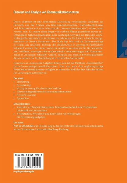 Dieses Lehrbuch ist eine einführende Darstellung verschiedener Verfahren des Entwurfs und der Analyse von Kommunikationsnetzen. Nachrichtentechniker und Informatiker mit dem Schwerpunkt "Kommunikationsnetze" sollten damit vertraut sein. Es spannt einen Bogen von exakten Planungsverfahren (sowie entsprechenden Näherungsverfahren) über Leistungsbewertung mit Hilfe der Warteschlangentheorie bis hin zu Verfahren, die Schranken für Ende-zu-Ende Leistungsparameter in Netzen bestimmen. Das Buch legt Wert auf die Zusammenhänge zwischen den einzelnen Themen, die üblicherweise in getrennten Fachbüchern behandelt werden. Der Autor weckt ein intuitives Verständnis für die beschriebenen Verfahren, weswegen viele mathematische Voraussetzungen und Zusammenhänge in Anhängen behandelt werden. Beispiele aus eigenen Forschungsarbeiten dienen vielfach zur Verdeutlichung der vermittelten Sachverhalte.