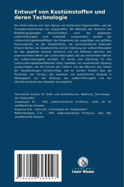 Die Arbeit widmet sich dem Design mit bestimmten Eigenschaften und der Produktionstechnologie von Anzugstoffen. Die Methodik des Entwurfs von Bekleidungsgeweben (Kostümstoffen) nach der gegebenen Luftdurchlässigkeit wird entwickelt, insbesondere werden der Luftdurchlässigkeitskoeffizient, der Prozentsatz des ungefüllten und gefüllten Fasermaterials an der Gewebefläche, die durchschnittliche Fadenzahl (lineare Dichte), die Gewebedichte und die Gleichung der Luftdurchlässigkeit für das gegebene Gewebe bestimmt und die Differenz zwischen den experimentellen Werten der Luftdurchlässigkeit und den berechneten Werten der Luftdurchlässigkeit ermittelt. Es wurde eine Gleichung für den Luftdurchlässigkeitskoeffizienten eines Gewebes mit quadratischer Bindung vorgeschlagen, die die Summe des Zählers und des Nenners des Anteils der Hauptbindungen berücksichtigt, und es wurden Studien über die Parameter der Struktur des Gewebes mit quadratischer Bindung in Abhängigkeit von der Bindung, der Luftdurchlässigkeit und der Oberflächendichte des Gewebes durchgeführt.