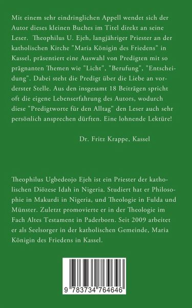 Mit einem sehr eindringlichen Appell wendet sich der Autor dieses kleinen Buches im Titel direkt an seine Leser. Theophilus U. Ejeh, langjähriger Priester an der katholischen Kirche "Maria Königin des Friedens" in Kassel, präsentiert eine Auswahl von Predigten mit so prägnanten Themen wie "Licht", "Berufung", "Entscheidung". Dabei steht die Predigt über die Liebe an vorderster Stelle. Aus den insgesamt 18 Beiträgen spricht oft die eigene Lebenserfahrung des Autors, wodurch diese "Predigtworte für den Alltag" den Leser auch sehr persönlich ansprechen dürften. Eine lohnende Lektüre! Dr. Fritz Krappe, Kassel