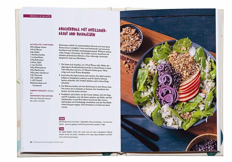 55 einfache Rezepte für Frühstück, Brunch, kalte und warme Mahlzeiten zeigen, wie lecker eine entzündungshemmende Ernährung sein kann. Und wie dabei Esspausen gelingen. Microgreens, Sprossen, Senfkaviar, Meerrettich und die berühmte Hühnersuppe sind erprobte Superfoods zum Selbermachen. Antioxidative Kräuter und Gewürze wie Kurkuma, Ingwer, Rosmarin geben jeder Mahlzeit im Handumdrehen eine heilende Wirkung. Die Anti-Entzündungskur hilft in akuten Fällen ebenso wie zur Prävention - für ein langes und gesundes Leben.
