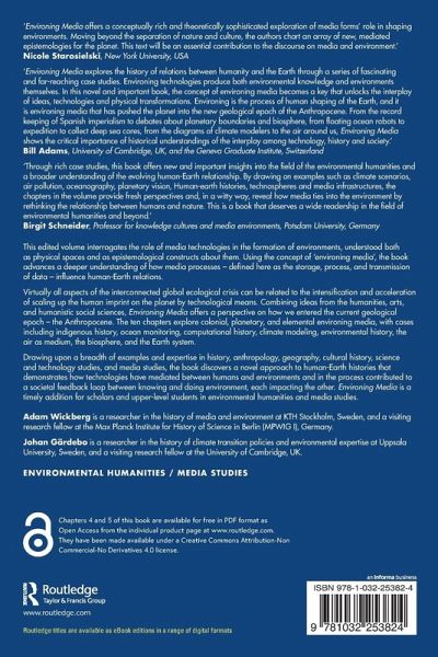 'Environing Media explores the history of relations between humanity and the Earth through a series of fascinating and far-reaching case studies. Environing technologies produce both environmental knowledge and environments themselves. In this novel and important book, the concept of environing media becomes a key that unlocks the interplay of ideas, technologies and physical transformations. Environing is the process of human shaping of the Earth, and it is environing media that has pushed the planet into the new geological epoch of the Anthropocene. From the record keeping of Spanish imperialism to debates about planetary boundaries and biosphere, from floating ocean robots to expedition to collect deep sea cores, from the diagrams of climate modelers to the air around us, Environing Media shows the critical importance of historical understandings of the interplay among technology, history and society.'