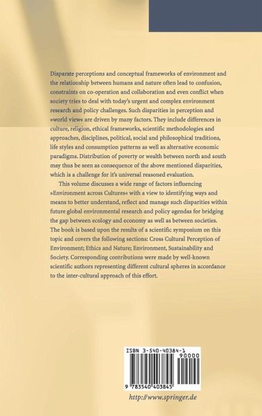 Disparate perceptions and conceptual frameworks of environment and the relationship between humans and nature often lead to confusion, constraints on co-operation and collaboration and even conflict when society tries to deal with today's urgent and complex environment research and policy challenges. Such disparities in perception and "world view" are driven by many factors. They include differences in culture, religion, ethical frameworks, scientific methodologies and approaches, disciplines, political, social and philosophical traditions, life styles and consumption patterns as well as alternative economic paradigms. Distribution of poverty or wealth between north and south may thus be seen as consequence of the above mentioned disparities, which is a challenge for it's universal reasoned evaluation. This volume discusses a wide range of factors influencing "Environment across Cultures" with a view to identifying ways and means to better understand, reflect and manage such disparities within future global environmental research and policy agendas for bridging the gap between ecology and economy as well as between societies. The book is based upon the results of a scientific symposium on this topic and covers the following sections: Cross Cultural Perception of Environment; Ethics and Nature; Environment, Sustainability and Society. Corresponding contributions were made by well-known scientific authors representing different cultural spheres in accordance with the inter-cultural approach of this effort.