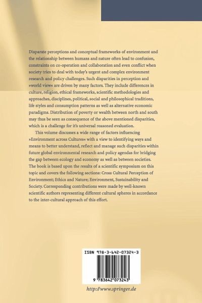 Disparate perceptions and conceptual frameworks of environment and the relationship between humans and nature often lead to confusion, constraints on co-operation and collaboration and even conflict when society tries to deal with today's urgent and complex environment research and policy challenges. Such disparities in perception and "world view" are driven by many factors. They include differences in culture, religion, ethical frameworks, scientific methodologies and approaches, disciplines, political, social and philosophical traditions, life styles and consumption patterns as well as alternative economic paradigms. Distribution of poverty or wealth between north and south may thus be seen as consequence of the above mentioned disparities, which is a challenge for it's universal reasoned evaluation. This volume discusses a wide range of factors influencing "Environment across Cultures" with a view to identifying ways and means to better understand, reflect and manage such disparities within future global environmental research and policy agendas for bridging the gap between ecology and economy as well as between societies. The book is based upon the results of a scientific symposium on this topic and covers the following sections: Cross Cultural Perception of Environment; Ethics and Nature; Environment, Sustainability and Society. Corresponding contributions were made by well-known scientific authors representing different cultural spheres in accordance with the inter-cultural approach of this effort.