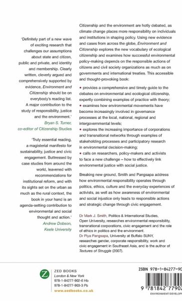 Citizenship and the environment are hotly debated, as climate change places more responsibility on individuals and institutions in shaping policy. Using new evidence and cases from across the globe, Environment and Citizenship explores the new vocabulary of ecological citizenship and examines how successful environmental policy-making depends on the responsible actions of citizens and civil society organizations as much as on governments and international treaties. This accessible and thought-provoking book: - provides a comprehensive and timely guide to the debates on environmental and ecological citizenship, expertly combining examples of practice with theory; - examines how environmental movements have become increasingly involved in governance processes at the local, national, regional and intergovernmental levels; - explores the increasing importance of corporations and transnational networks through examples of stakeholding processes and participatory research in environmental decision-making; - calls on researchers, policy-makers and activists to face a new challenge: how to effectively link environmental justice with social justice. Breaking new ground, Smith and Pangsapa address how environmental responsibility operates through politics, ethics, culture and the everyday experiences of ctivists, as well as how awareness of environmental and social injustice only leads to responsible actions and strategic change through civic engagement.