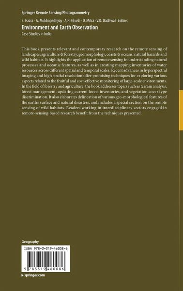 This book presents relevant and contemporary research on the remote sensing of landscapes, agriculture & forestry, geomorphology, coasts & oceans, natural hazards and wild habitats. It highlights the application of remote sensing in understanding natural processes and oceanic features, as well as in creating mapping inventories of water resources across different spatial and temporal scales. Recent advances in hyperspectral imaging and high spatial resolution offer promising techniques for exploring various aspects related to the fruitful and cost-effective monitoring of large-scale environments. In the field of forestry and agriculture, the book addresses topics such as terrain analysis, forest management, updating current forest inventories, and vegetation cover type discrimination. It also elaborates delineation of various geo-morphological features of the earth's surface and natural disasters, and includes a special section on the remote sensing of wild habitats. Readers working in interdisciplinary sectors engaged in remote-sensing-based research benefit from the techniques presented.