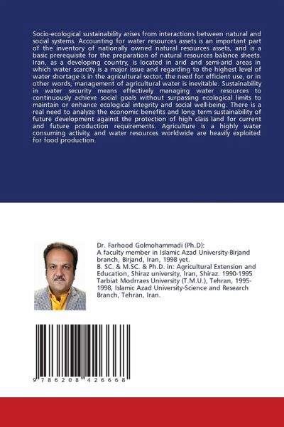 Socio-ecological sustainability arises from interactions between natural and social systems. Accounting for water resources assets is an important part of the inventory of nationally owned natural resources assets, and is a basic prerequisite for the preparation of natural resources balance sheets. Iran, as a developing country, is located in arid and semi-arid areas in which water scarcity is a major issue and regarding to the highest level of water shortage is in the agricultural sector, the need for efficient use, or in other words, management of agricultural water is inevitable. Sustainability in water security means effectively managing water resources to continuously achieve social goals without surpassing ecological limits to maintain or enhance ecological integrity and social well-being. There is a real need to analyze the economic benefits and long term sustainability of future development against the protection of high class land for current and future production requirements. Agriculture is a highly water consuming activity, and water resources worldwide are heavily exploited for food production.