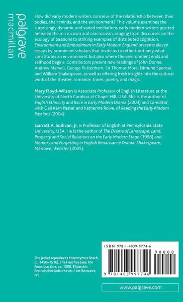 List of Illustrations Acknowledgments Notes on Contributors Introduction: Inhabiting the Body, Inhabiting the World; G.Sullivan & M.Floyd-Wilson Spongy Brains and Material Memories; J.Sutton Marvell's Amazing Garden; M.Thomas Crane The Souls of Animals: John Donne's Metempsychosis and Early Modern Natural History; E.D.Harvey Affective Irony: Toward an Emotional Logic of the Elizabethan Stage; S.Mullaney Inconstancy: Changeable Affections in Stuart Dramas of Contract; K.Rowe The East in British-American Writing: English Identity, John Smith's True Travels , and Severed Heads; J.Egan 'My liquid journey': The Frontispiece to Coryat's Crudities (1611); D.J.Baker Becoming the Landscape: The Ecology of the Passions in the Legend of Temperance; G.Kern Paster 'The Material Point of Poesy': Reading, Writing and Sensation in Puttenham's The Art of English Poesie K.Craik Spelling the Body; T.Pollard Humanist Habitats; Or, 'Eating Well' with Thomas More's Utopia ; J.Yates Index