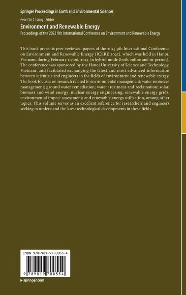 This book presents peer-reviewed papers of the 2023 9th International Conference on Environment and Renewable Energy (ICERE 2023), which was held in Hanoi, Vietnam, during February 24-26, 2023, in hybrid mode (both online and in-person). The conference was sponsored by the Hanoi University of Science and Technology, Vietnam, and facilitated exchanging the latest and most advanced information between scientists and engineers in the fields of environment and renewable energy. The book focuses on research related to environmental management; water resources management; ground water remediation; water treatment and reclamation; solar, biomass and wind energy; nuclear energy engineering; renewable energy grids; environmental impact assessment; and renewable energy utilization, among other topics. This volume serves as an excellent reference for researchers and engineers seeking to understand the latest technological developments in these fields.