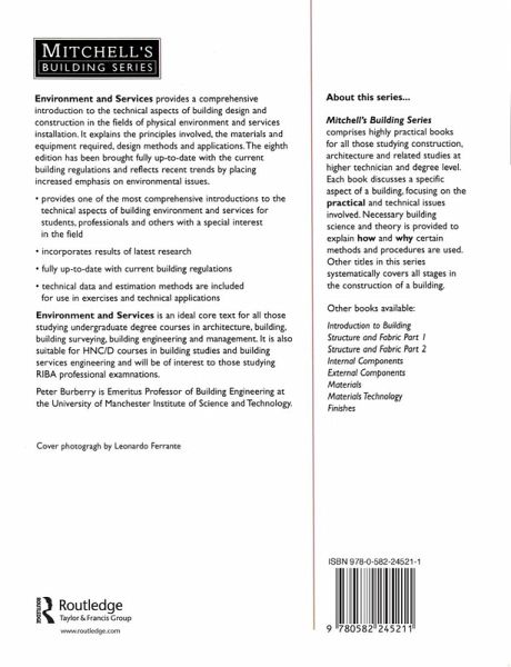 Environment and Services provides a comprehensive introduction to the technical aspects of building design and construction in the fields of physical environment and services installation. It explains the principles involved, the materials and equipment required, design methods and applications. The eighth edition has been brought fully up-to-date with the current building regulations and reflects recent trends by placing increased emphasis on environmental issues related to buildings. The book is suitable for undergraduate degree courses in building, building surveying, building engineering and management, and architecture. It is also suitable for HNC/D courses in building studies and building services engineering as well as CIOB and RIBA examinations.