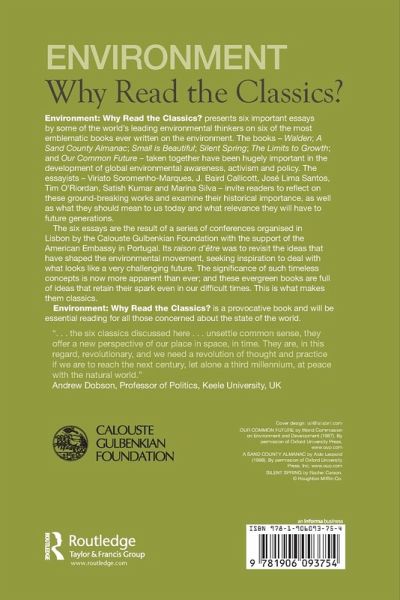 Environment: Why Read the Classics? presents six important essays by some of the world's leading environmental thinkers on six of the most emblematic books ever written on the environment. The books - Walden; A Sand County Almanac; Small is Beautiful; Silent Spring; The Limits to Growth; and Our Common Future - taken together have been hugely important in the development of global environmental awareness, activism and policy. The essayists - Viriato Soromenho-Marques, J. Baird Callicott, José Lima Santos, Tim O'Riordan, Satish Kumar and Marina Silva - invite readers to reflect on these ground-breaking works and examine their historical importance, as well as what they should mean to us today and what relevance they will have to future generations. More than just books about the environment, these are also philosophical treatises, in that they increase our understanding of the natural world and of ourselves, calling us "to weigh and consider", as Bacon put it. In particular, they make us reflect on the need to constantly redefine the purposes of progress, the economy and society. How we relate to nature is a crucial aspect in the plans we make as a species, and as individuals; and every one of these books inspires a more respectful relationship, both with nature and humanity, and consequently with ourselves. The six essays in this book are the result of a series of conferences organised in Lisbon by the Calouste Gulbenkian Foundation with the support of the American Embassy in Portugal. Its *raison d'être* was to revisit the ideas that have shaped the environmental movement, seeking inspiration to deal with what looks like a very challenging future. The significance of such timeless concepts is now more apparent than ever; and these evergreen books are full of ideas that retain their spark even in our difficult times. This is what makes them classics. Environment: Why Read the Classics? is a provocative book and will be essential reading for all those concerned about the state of the world.