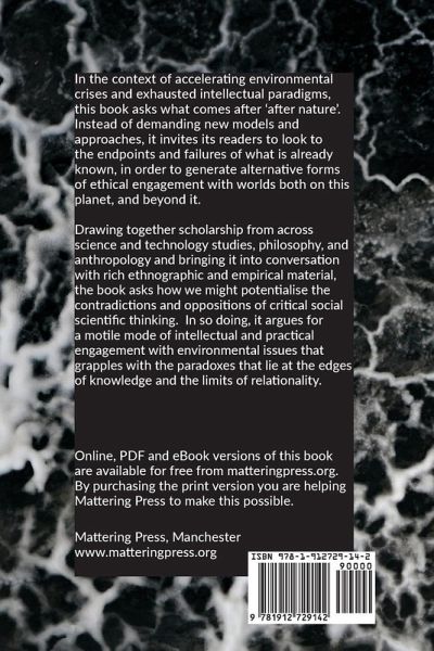 In the context of accelerating environmental crises and exhausted intellectual paradigms, this book asks what comes after 'after nature'. Instead of demanding new models and approaches, it invites its readers to look to the endpoints and failures of what is already known, in order to generate alternative forms of ethical engagement with worlds both on this planet, and beyond it. Drawing together scholarship from across science and technology studies, philosophy, and anthropology and bringing it into conversation with rich ethnographic and empirical material, the book asks how we might potentialise the contradictions and oppositions of critical social scientific thinking in order to develop a mode of paradoxical engagement that is in constant movement between knowledge and its edges, practices and their limits, and which allows us to relate to that which is excessive to relations and relationality. The chapters in the book range across very different empirical settings and communities of people, from fishermen in the Scottish seas, the sea folk of Indonesian archipelagos, indigenous peoples in forests in Lowland Ecuador, primatologists in the jungle of DR Congo, the personal and domestic space of living with dogs and the cosmological scale of planetary interactions. Each chapter explores different modes of environmental relationality and alterity by grappling with the spaces in-between - the contradictions, uncertainties, limits, excesses and liminalities which make up people's everyday relations with their environments. The chapters are accompanied by in-depth conversations between scholars who frankly discuss the proposals of the book and the arguments of each chapter, with a view to inviting further reflection and discussion amongst the book's readers. As the chapters and conversations in this book show, admitting that we still do not know what the environment is, even in times of crisis, can be a form of hopeful, humble environmental politics.