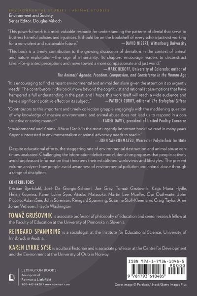 The theory of denialism proposes that people actively avoid information that threatens their established worldviews, lifestyles, and identities. Environmental and Animal Abuse Denial: Averting Our Gaze analyzes how people use denialism to avoid awareness of climate change, environmental pollution, animal abuse, and the animal industrial complex.