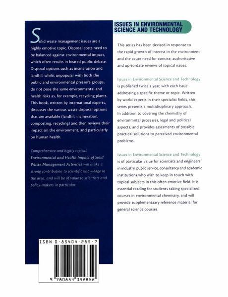 Solid waste management issues are a highly emotive topic. Disposal costs need to be balanced against environmental impact, which often results in heated public debate. Disposal options such as incineration and landfill, whilst unpopular with both the public and environmental pressure groups, do not pose the same environmental and health risks as, for example, recycling plants. This book, written by international experts, discusses the various waste disposal options that are available (landfill, incineration, composting, recycling) and then reviews their impact on the environment, and particularly on human health. Comprehensive and highly topical, Environmental and Health Impact of Solid Waste Management Activities will make a strong contribution to scientific knowledge in the area, and will be of value to scientists and policy-makers in particular.