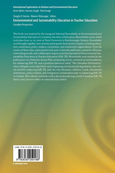 1 Environmental and Sustainability Education in Teacher Education: Canadian Perspectives; Douglas D. Karrow, Maurice DiGiuseppe, and Hilary Inwood.- Part I - The Importance of Environmental and Sustainability EDUCATION in Teacher Education.- 2 Teacher Education Around the World: ESD at the Heart of Education - Responsibilities and Opportunities Towards a Sustainable Future for All;Charles A. Hopkins and Katrin Kohl.- 3 Contextualising ESE in Preservice Teacher Education in Canada; Paul Elliott and Hilary Inwood.- 4 Transversality, Diversity, Criticality, and Activism: Enhancing E(S)E in Teacher Education; Lucie Sauvé.- 5 Anishinaabe Bimaadiziwin: Living Spiritually With Respect, Relationship, Reciprocity, and Responsibility; Nicole Bell.- 6 Place Matters in Teacher Education; Dianne M. Miller and Barbara Mills Wotherspoon.- Part II - Environmental and Sustainability Teacher Education Programs.- 7 Preservice Teacher Environmental Education Capacities: What Is the Role of Ontario's Faculties of Education?; Douglas D. Karrow, Maurice DiGiuseppe, Paul Elliott, Xavier Fazio, and Hilary Inwood.- 8 Learning to Teach Environmental Education by Gardening the Margins of the Academy; Julia K. Ostertag, Susan G. Gerofsky, and Sandra A. Scott.- 9 Rising to the Challenge: Promoting Environmental Education in Three Ontario Faculties of Education; Maurice DiGiuseppe, Paul Elliott, Sheliza Ibrahim Khan, Sheila Rhodes, Jeff Scott, and Astrid Steele.- 10 Environmental Literacy for All: Innovating Environmental Education for Teacher Education Majors and Non-Education Majors; Yovita N. Gwekwerere.- 11 Re-Visioning Teacher Education for Sustainability in Atlantic Canada; Patrick Howard.- 12 From Relationship to Something More: Environmental and Sustainability Education and a New Ontological Position; Chris Beeman and Laura Sims.- 13 Growing Innovative Approaches to Environmental and Sustainability Education in Teacher Education Programs; Hilary Inwood.- 14 Creation Care as a Basis for Environmental Education in Preservice Teacher Education; Joanne Nazir.- 15 A Direction for Outdoor and Environmental Education: Assessing and Addressing UNECE Capacities for Preservice Teachers; Erin Sperling, Darren Hoeg, and Douglas D. Karrow.- Part III - Supporting Environmental and Sustainability Teacher Education.- 16 Encouraging Pro-Environmental Behaviour: Joining Theory and Practice to Inform Teacher Education; Brittany A. Harding.- 17 Preservice Teacher Professional Development in Education for Sustainable Development; Ying-Syuan (Elaine) Huang and Anila Asghar.- 18 Supporting New Teachers in Environmental and Sustainability Education: The Pathway to Stewardship and Kinship; Paul Elliott and Jacob Rodenburg.- Part IV - Conclusion: Contextualizing, Assessing, and Projecting.- 19 Exploring Canadian ESE-PTE in the Context of International ESE-PTE; Douglas D. Karrow and Maurice DiGiuseppe.- Subject Glossary.- Index.