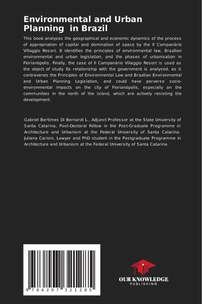 This book analyses the geographical and economic dynamics of the process of appropriation of capital and domination of space by the Il Campanário Villaggio Resort. It identifies the principles of environmental law, Brazilian environmental and urban legislation, and the phases of urbanisation in Florianópolis. Finally, the case of Il Campanário Villaggio Resort is used as the object of study. Its relationship with the government is analysed, as it contravenes the Principles of Environmental Law and Brazilian Environmental and Urban Planning Legislation, and could have perverse socio-environmental impacts on the city of Florianópolis, especially on the communities in the north of the island, which are actively resisting the development.