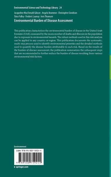 This publication characterizes the environmental burden of disease in the United Arab Emirates (UAE), measured by the excess number of deaths and illnesses in the population due to exposure to environmental hazards. The robust methods used in this risk analysis can be applied to any country or region. This publication documents the systematic, multi-step process used to identify environmental priorities and the detailed methods used to quantify the disease burden attributable to each risk. Based on the results of the burden of disease assessment, the publication summarizes the subsequent steps that are recommended to further reduce the burden of disease resulting from various environmental risk factors.