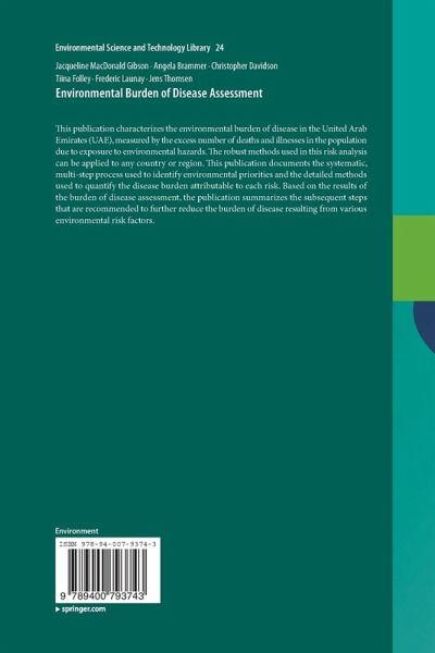 This publication characterizes the environmental burden of disease in the United Arab Emirates (UAE), measured by the excess number of deaths and illnesses in the population due to exposure to environmental hazards. The robust methods used in this risk analysis can be applied to any country or region. This publication documents the systematic, multi-step process used to identify environmental priorities and the detailed methods used to quantify the disease burden attributable to each risk. Based on the results of the burden of disease assessment, the publication summarizes the subsequent steps that are recommended to further reduce the burden of disease resulting from various environmental risk factors.