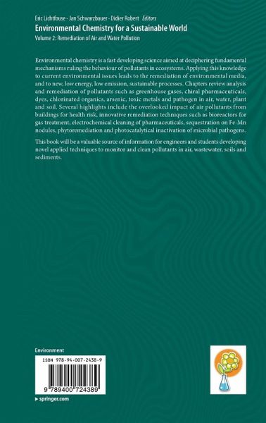 Environmental chemistry is a fast developing science aimed at deciphering fundamental mechanisms ruling the behaviour of pollutants in ecosystems. Applying this knowledge to current environmental issues leads to the remediation of environmental media, and to new, low energy, low emission, sustainable processes. Chapters review analysis and remediation of pollutants such as greenhouse gases, chiral pharmaceuticals, dyes, chlorinated organics, arsenic, toxic metals and pathogen in air, water, plant and soil. Several highlights include the overlooked impact of air pollutants from buildings for health risk, innovative remediation techniques such as bioreactors for gas treatment, electrochemical cleaning of pharmaceuticals, sequestration on Fe-Mn nodules, phytoremediation and photocatalytical inactivation of microbial pathogens.