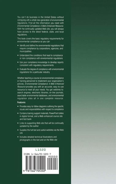 STAY INFORMED-STAY COMPLIANT-STAY UP-TO-DATEYou can't do business in the United States without complying with a whole new generation of environmental regulations. Get all the information you need with Environmental Compliance: A Web-Enhanced Resource. This resource will never be outdated. With the continually updated Web site, you will always have access to the latest Federal, state, and local regulations. ENVIRONMENTAL PROFESSIONALSIf you are in charge of implementing your company's environmental compliance you need accurate up-to-date information on environmental laws and standards. If you are in charge of training personnel you need quick easy access to training materials. Environmental Compliance: A Web-Enhanced Resource provides you with an accurate, easy-to-use resource that meets all these needs. You get weblinks to: search engines, electronic libraries, electric on-line journals, environmental searchable databases, and environmental regulation sites all in one complete resource.ENVIRONMENTAL PROFESSORS When you teach a course on environmental compliance, you require time- and energy-saving course materials that give you everything you need to be fully prepared. You need ready-made resources on hand. Environmental Compliance: A Web-Enhanced Resource provides you with a test bank, review questions, downloadable PowerPoint® slides, and useful weblinks. Your students will learn faster and learn more by taking advantage of the resources available on the Web site.GOALS AND OBJECTIVESThis book covers the basic regulatory and state requirements for environmental compliance so you can:Identify and define the environmental regulations that require compliance by corporations, agencies, and municipalitiesUnderstand the conditions that provide compliance or non-compliance with environmental regulationsUse your compliance knowledge by developing reports consistent with regulatory