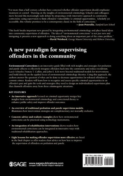 A new paradigm for supervising offenders in the community Environmental Corrections is an innovative guide filled with rich insights and strategies for probation and parole officers to effectively integrate offenders back into the community and reduce recidivism. Authors Lacey Schaefer, Francis T. Cullen, and John E. Eck move beyond traditional models for interventions and build directly on the applied focus of environmental criminology theories. Using this approach, the authors answer the question of what officers can do to decrease opportunities for an offender to commit a crime. Readers will learn how to recognize and assess specific criminal opportunities in an offender’s past and gain the tools and strategies they need to design an individualized supervision plan that channels offenders away from these criminogenic situations.