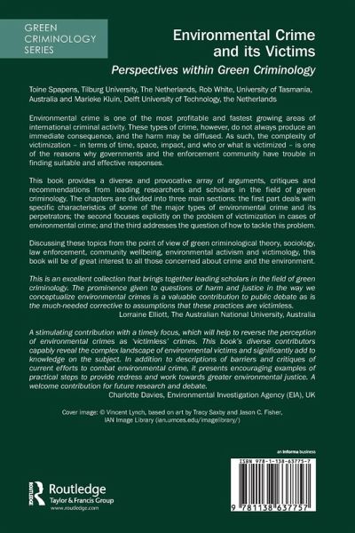 Introduction; I: Examining the Crime and the Victimization Problem; 1: The Criminogenic Effects of Environmental Harm: Bringing a 'Green' Perspective to Mainstream Criminology; 2: Climate Change: A State-corporate Crime Perspective; 3: The Corporation as Villain and Victim: Reflections on Privilege, Complicity, Awareness, and Accountability; 4: Environmental Victims and Criminal Justice: Proceed with Caution; 5: Eco-justice and Problem-solving Approaches to Environmental Crime and Victimisation; 6: Victims of Environmental Crime: Routes for Recognition, Restitution and Redress; II: Characteristics of Different Types of Environmental Crime; 7: Trade in 'Dirty Air': Carbon Crime and the Politics of Pollution; 8: Oil Spills: A Persistent Problem; 9: A Decade of Violations in the Dutch Chemical Industry; 10: Illegal E-waste Transports: Exploring their Harmfulness, Scale, Social Organization and Governance; 11: Camouflage-collar Crime: An Examination of Wildlife Crime and Characteristics of Offenders in Florida; 12: On the Relationship between Animal Victimization and Stigmatization of Ethnic Groups: The Case of Ritual Slaughter; III: Combating Environmental Crime; 13: Invisible Victims: the Problem of Policing Environmental Crime; 14: Project LEAF, and Interpol's Work on Illegal Logging and Forest Crime; 15: Communities as Victims of Environmental Crime: Lessons from the Field; 16: The Treadmill of Production, Planetary Boundaries and Green Criminology; 17: Assessing the Partner and Media Engagement with the International Consortium on Combating Wildlife Crime