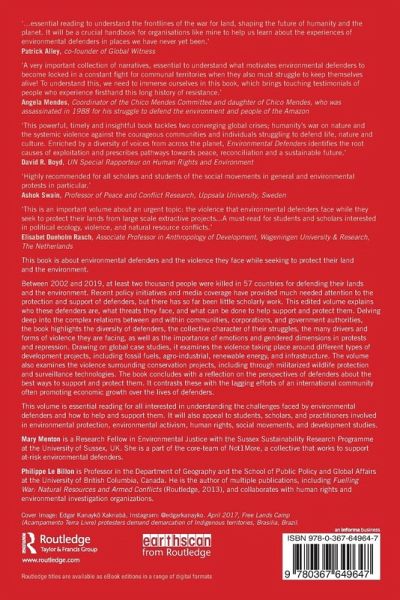 This book is about environmental defenders and the violence they face while seeking to protect their land and the environment. Between 2002 and 2019, at least two thousand people were killed in 57 countries for defending their lands and the environment. Recent policy initiatives and media coverage have provided much needed attention to the protection and support of defenders, but there has so far been little scholarly work. This edited volume explains who these defenders are, what threats they face, and what can be done to help support and protect them. Delving deep into the complex relations between and within communities, corporations, and government authorities, the book highlights the diversity of defenders, the collective character of their struggles, the many drivers and forms of violence they are facing, as well as the importance of emotions and gendered dimensions in protests and repression. Drawing on global case studies, it examines the violence taking place around different types of development projects, including fossil fuels, agro-industrial, renewable energy, and infrastructure. The volume also examines the violence surrounding conservation projects, including through militarized wildlife protection and surveillance technologies. The book concludes with a reflection on the perspectives of defenders about the best ways to support and protect them. It contrasts these with the lagging efforts of an international community often promoting economic growth over the lives of defenders. This volume is essential reading for all interested in understanding the challenges faced by environmental defenders and how to help and support them. It will also appeal to students, scholars and practitioners involved in environmental protection, environmental activism, human rights, social movements and development studies.