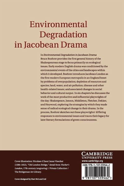 In Environmental Degradation in Jacobean Drama, Bruce Boehrer provides the first general history of the Shakespearean stage to focus primarily on ecological issues. Early modern English drama was conditioned by the environmental events of the cities and landscapes within which it developed. Boehrer introduces Jacobean London as the first modern European metropolis in an England beset by problems of overpopulation; depletion of resources and species; land, water and air pollution; disease and other health-related issues; and associated changes in social behavior and cultural output. In six chapters he discusses the work of the most productive and influential playwrights of the day: Shakespeare, Jonson, Middleton, Fletcher, Dekker and Heywood, exploring the strategies by which they made sense of radical ecological change in their drama. In the process, Boehrer sketches out these playwrights' differing responses to environmental issues and traces their legacy for later literary formulations of green consciousness.