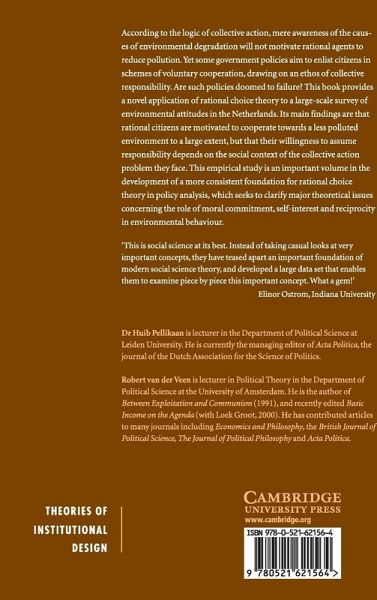 According to the logic of collective action, mere awareness of the causes of environmental degradation will not motivate rational agents to reduce pollution. Yet some government policies aim to enlist citizens in schemes of voluntary cooperation, drawing on an ethos of collective responsibility. Are such policies doomed to failure? This book provides a novel application of rational choice theory to a large-scale survey of environmental attitudes in The Netherlands. Its main findings are that rational citizens are motivated to cooperate towards a less polluted environment to a large extent, but that their willingness to assume responsibility depends on the social context of the collective action problem they face. This empirical study is an important volume in the development of a more consistent foundation for rational choice theory in policy analysis, which seeks to clarify major theoretical issues concerning the role of moral commitment, self-interest and reciprocity in environmental behaviour.