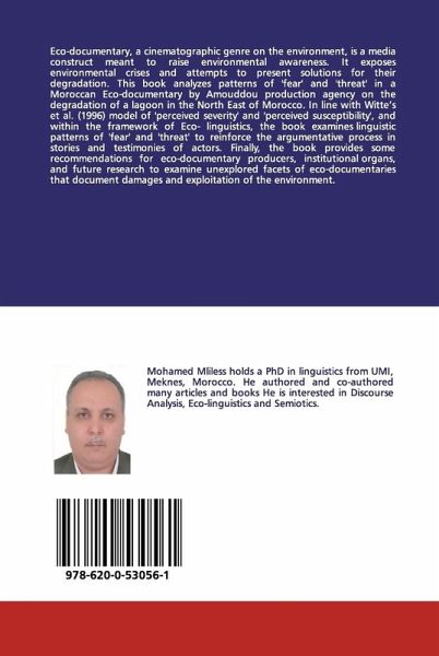 Eco-documentary, a cinematographic genre on the environment, is a media construct meant to raise environmental awareness. It exposes environmental crises and attempts to present solutions for their degradation. This book analyzes patterns of 'fear' and 'threat' in a Moroccan Eco-documentary by Amouddou production agency on the degradation of a lagoon in the North East of Morocco. In line with Witte's et al. (1996) model of 'perceived severity' and 'perceived susceptibility', and within the framework of Eco- linguistics, the book examines linguistic patterns of 'fear' and 'threat' to reinforce the argumentative process in stories and testimonies of actors. Finally, the book provides some recommendations for eco-documentary producers, institutional organs, and future research to examine unexplored facets of eco-documentaries that document damages and exploitation of the environment.