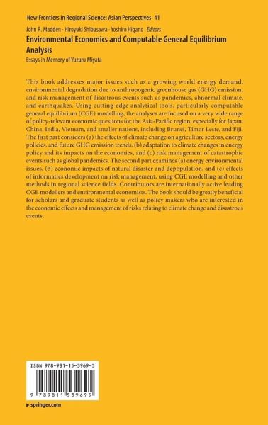 Memorial Address for Professor Yuzuru Miyata.- Part I Issues in Environment, Energy and Risk Management - Analysis with CGE Models.- Chapter 1: Evidence-based Analysis of Issues in Environment, Energy and Disasters with CGE Models: An Introduction to Part I.- Chapter 2: Do fertilizer and electricity subsidies benefit Indian farmers? a hybrid regional CGE analysis with back-of-the-envelope explanations.- Chapter 3: Can China achieve over the medium-term strong economic growth with ambitious targets for energy efficiency and greenhouse gas emissions?.- Chapter 4: Analysing policy impact in preparation for post-hydrocarbon era of Brunei Darussalam.- Chapter 5: Assessing the economic impacts of changes in crop production due to climate change and adaptation in Vietnam.- Chapter 6: Climate Change Impacts on Agriculture and Internal Migration in Brazil.- Chapter 7: Closing the yield gap in livestock production in Brazil: new results and emissions insights.- Chapter 8: The economic impacts of UK fiscal policies and their spillover effects on the energy system.- Chapter 9: Modelling the economic impacts of epidemics in developing countries under alternative intervention strategies.- Part II Issues in Environment, Energy, Risk Management and Economic Development -Japan's Perspectives.- Chapter 10: Critical Factors Affecting the Socio-economy of Japan: An Introductory Essay to Part II.- Chapter 11: Energy Intensity and Population Density in Japan.- Chapter 12: Can Japanese economy grow under population decline? Evidence from dynamic spatial CGE model with endogenous growth mechanism.- Chapter 13: The General Perspective of Japanese Agricultural Policy that Appears from Rice Riots and Artificial Intelligence.- Chapter 14: Recovery Process of Municipal Economies after a Tsunami in Aichi Prefecture, Japan: A Dynamic Input-Output Approach.- Chapter 15: Spatial Analysis of Climate Change Impacts on Regional Economies through Japan's Rice Production Changes and Innovative Food Industry Cluster: Using the Nine Interregional CGE Model.- Chapter 16: Environmental Regulation for Non-point Source Pollution in a Cournot Three-stage Game.- Chapter 17: Unexpected Natural Disasters and Regional Economies: CGE Analysis Based on Inter-Regional Input-Output Tables in Japan.- Chapter 18: Survival Strategies of the Displaced People Due to Riverbank Erosion: A Study of Victims Living on the Bank of Padma River, Bangladesh.- Chapter 19: Gender and Age as Factors in Disaster Vulnerability: A Study of River Erosion Victims in Bogra District, Bangladesh