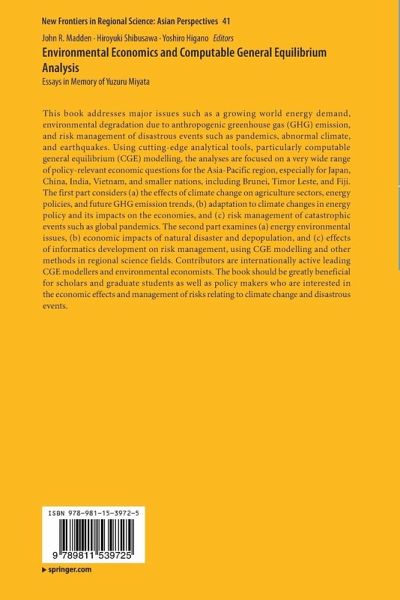 Memorial Address for Professor Yuzuru Miyata.- Part I Issues in Environment, Energy and Risk Management - Analysis with CGE Models.- Chapter 1: Evidence-based Analysis of Issues in Environment, Energy and Disasters with CGE Models: An Introduction to Part I.- Chapter 2: Do fertilizer and electricity subsidies benefit Indian farmers? a hybrid regional CGE analysis with back-of-the-envelope explanations.- Chapter 3: Can China achieve over the medium-term strong economic growth with ambitious targets for energy efficiency and greenhouse gas emissions?.- Chapter 4: Analysing policy impact in preparation for post-hydrocarbon era of Brunei Darussalam.- Chapter 5: Assessing the economic impacts of changes in crop production due to climate change and adaptation in Vietnam.- Chapter 6: Climate Change Impacts on Agriculture and Internal Migration in Brazil.- Chapter 7: Closing the yield gap in livestock production in Brazil: new results and emissions insights.- Chapter 8: The economic impacts of UK fiscal policies and their spillover effects on the energy system.- Chapter 9: Modelling the economic impacts of epidemics in developing countries under alternative intervention strategies.- Part II Issues in Environment, Energy, Risk Management and Economic Development -Japan's Perspectives.- Chapter 10: Critical Factors Affecting the Socio-economy of Japan: An Introductory Essay to Part II.- Chapter 11: Energy Intensity and Population Density in Japan.- Chapter 12: Can Japanese economy grow under population decline? Evidence from dynamic spatial CGE model with endogenous growth mechanism.- Chapter 13: The General Perspective of Japanese Agricultural Policy that Appears from Rice Riots and Artificial Intelligence.- Chapter 14: Recovery Process of Municipal Economies after a Tsunami in Aichi Prefecture, Japan: A Dynamic Input-Output Approach.- Chapter 15: Spatial Analysis of Climate Change Impacts on Regional Economies through Japan's Rice Production Changes and Innovative Food Industry Cluster: Using the Nine Interregional CGE Model.- Chapter 16: Environmental Regulation for Non-point Source Pollution in a Cournot Three-stage Game.- Chapter 17: Unexpected Natural Disasters and Regional Economies: CGE Analysis Based on Inter-Regional Input-Output Tables in Japan.- Chapter 18: Survival Strategies of the Displaced People Due to Riverbank Erosion: A Study of Victims Living on the Bank of Padma River, Bangladesh.- Chapter 19: Gender and Age as Factors in Disaster Vulnerability: A Study of River Erosion Victims in Bogra District, Bangladesh