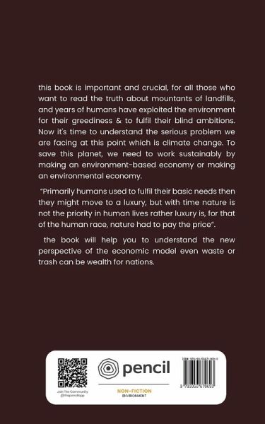 this book is important and crucial, for all those who want to read the truth about mountants of landfills, and years of humans have exploited the environment for their greediness & to fulfil their blind ambitions. Now it's time to understand the serious problem we are facing at this point which is climate change. To save this planet, we need to work sustainably by making an environment-based economy or making an environmental economy. "Primarily humans used to fulfil their basic needs then they might move to a luxury, but with time nature is not the priority in human lives rather luxury is, for that of the human race, nature had to pay the price". the book will help you to understand the new perspective of the economic model even waste or trash can be wealth for nations.