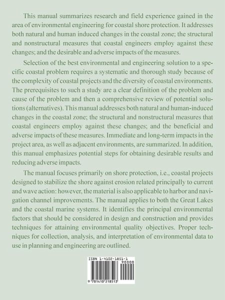 This manual summarizes research and field experience gained in the area of environmental engineering for coastal shore protection. It addresses both natural and human induced changes in the coastal zone; the structural and nonstructural measures that coastal engineers employ against these changes; and the desirable and adverse impacts of the measures. Selection of the best environmental and engineering solution to a specific coastal problem requires a systematic and thorough study because of the complexity of coastal projects and the diversity of coastal environments. The prerequisites to such a study are a clear definition of the problem and cause of the problem and then a comprehensive review of potential solutions (alternatives). This manual addresses both natural and human-induced changes in the coastal zone; the structural and nonstructural measures that coastal engineers employ against these changes; and the beneficial and adverse impacts of these measures. Immediate and long-term impacts in the project area, as well as adjacent environments, are summarized. In addition, this manual emphasizes potential steps for obtaining desirable results and reducing adverse impacts. The manual focuses primarily on shore protection, i.e., coastal projects designed to stabilize the shore against erosion related principally to current and wave action: however, the material is also applicable to harbor and navigation channel improvements. The manual applies to both the Great Lakes and the coastal marine systems. It identifies the principal environmental factors that should be considered in design and construction and provides techniques for attaining environmental quality objectives. Proper techniques for collection, analysis, and interpretation of environmental data to use in planning and engineering are outlined.