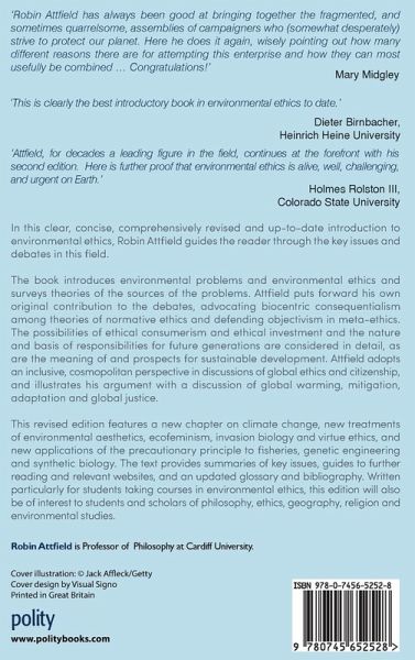 In this clear, concise, comprehensively revised and up-to-date introduction to environmental ethics, Robin Attfield guides the student through the key issues and debates in this field in ways that will also be of interest to a wide range of scholars and researchers. The book introduces environmental problems and environmental ethics and surveys theories of the sources of the problems. Attfield also puts forward his own original contribution to the debates, advocating biocentric consequentialism among theories of normative ethics and defending objectivism in meta-ethics. The possibilities of ethical consumerism and investment are discussed, and the nature and basis of responsibilities for future generations in such areas as sustainable development are given detailed consideration. Attfield adopts an inclusive, cosmopolitan perspective in discussions of global ethics and citizenship, and illustrates his argument with a discussion of global warming, mitigation, adaptation and global justice. The revised edition features a new chapter on climate change, new treatments of animal issues, ecofeminism, environmental aesthetics, invasion biology and virtue ethics, and new applications of the precautionary principle to fisheries, genetic engineering and synthetic biology. The glossary and bibliography have been updated to assist understanding of these themes. The text uses a range of devices to aid understanding, such as summaries of key issues, and guides to further reading and relevant websites. It has been written particularly with a view to the needs of students taking courses in environmental ethics, and will be of interest to students and scholars of philosophy, ethics, geography, religion and environmental studies. -- Provided by publisher.
