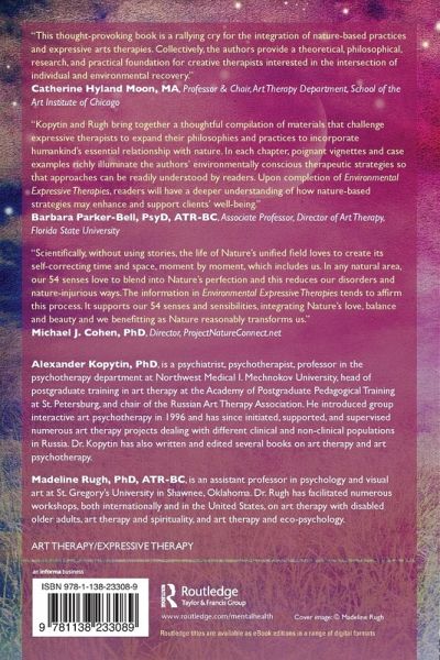 Environmental Expressive Therapies contributes to the emerging phenomenon of eco-arts therapy by highlighting the work that international expressive arts therapists have accomplished to establish a framework for incorporating nature as a partner in creative/expressive arts therapy practices. Each of the contributors explores a particular specialization and outlines the implementation of multi-professional and multi-modal "earth-based" creative/expressive interventions that practitioners can use in their daily work with patients with various clinical needs. Different forms of creative/expressive practices-such as creative writing, play therapy techniques, visual arts, expressive music, dramatic performances, and their combinations with wilderness and animal-assisted therapy-are included in order to maximize the spectrum of treatment options. Environmental Expressive Therapies represents a variety of practical approaches and tools for therapists to use to achieve multiple treatment goals and promote sustainable lifestyles for individuals, families, and communities.