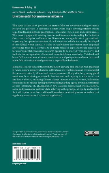 This open access book presents the state-of-the-art environmental governance research and practices in Indonesia. It offers a wide scope, covering different sectors (e.g., forestry, mining) and geographical landscapes (e.g., inland and coastal areas). This book engages with existing theories and frameworks, including Earth System Governance, Adaptive and Interactive Governance, among others to trigger a debate regarding the operationalization of such concepts, which are mostly developed for the Global North context. It is also our ambition to incorporate more empirical knowledge from local contexts to indicate research gaps and future directions for environmental governance research agenda to be more diverse, inclusive, and facilitate the incorporation of inter-and transdisciplinary knowledge. This book will be useful for researchers, students, practitioners, and policymakers who are interested in the field of environmental governance, especially in Indonesia.
