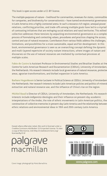 The multiple purposes of nature - livelihood for communities, revenues for states, commodities for companies, and biodiversity for conservationists - have turned environmental governance in Latin America into a highly contested arena. In such a resource-rich region, unequal power relations, conflicting priorities, and trade-offs among multiple goals have led to a myriad of contrasting initiatives that are reshaping social relations and rural territories. This edited collection addresses these tensions by unpacking environmental governance as a complex process of formulating and contesting values, procedures and practices shaping the access, control and use of natural resources. Contributors from various fields address the challenges, limitations, and possibilities for a more sustainable, equal, and fair development. In this book, environmental governance is seen as an overarching concept defining the dynamic and multi-layered repertoire of society-nature interactions, where images of nature and discourses on the use of natural resources are mediated by contextual processes at multiple scales.