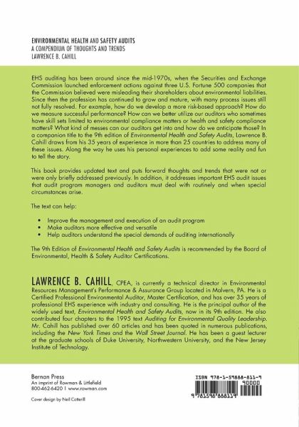 Environmental Health and Safety Audits: A Compendium of Thoughts and Trends By Lawrence B. Cahill, CPEA Dedication Contributing Author ChapterTitle 1Introduction 2U.S. EH&S Regulatory Trends in 2015: How they affect audit programs. 3Measuring the Success of an EH&S Audit Program: What are the Best Metrics? 4EH&S Audits: Have We Lost Our Way? 5Where Have You Gone, Ernest Hemingway? Tips on Writing Exceptional Audit Findings 6Twenty Lessons Learned on International Assignments: The Good and the Bad 7Classic Auditor Failures: How do Auditors Mess Up? 8Repeat Versus Recurring Findings on EH&S Audits: Should Management Treat Them Differently? 9Environmental Audits Versus Health and Safety Audits: What's the Difference for Auditors? 10Using Risk Factors to Determine EH&S Audit Frequency: How to Best Manage Resources. 11Outsourcing EH&S Audits: Does it Make Sense? 12Statistically Representative Sampling on EH&S Audits: Expectations Established by Third Parties 13A Final Perspective: Lessons Learned in 35 Years of Auditing AfterwordReflections on First Earth Day, April 22, 1970