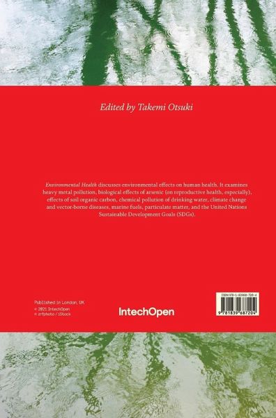Environmental Health discusses environmental effects on human health. It examines heavy metal pollution, biological effects of arsenic (on reproductive health, especially), effects of soil organic carbon, chemical pollution of drinking water, climate change and vector-borne diseases, marine fuels, particulate matter, and the United Nations Sustainable Development Goals (SDGs).