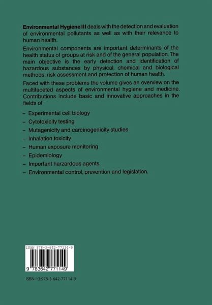 ENVIRONMENTAL HYGIENE III deals with the detection andevaluation of environmental pollutants as well as with theirrelevance to human health.Environmental components are important determinants of thehealth status of groups at risk and of the generalpopulation. The main objective is the early detection andidentification of hazardous substances by physical, chemicaland biological methods, risk assessment andprotection ofhuman health.Faced with these problems the volume gives an overview onthe mulifaceted aspects of environmental hygiene andmedicine. Contributions include basic and innovativeapproaches in the fields of- Experimental cell biology- Cytotoxicity testing- Mutagenicity and carcinogenicity studies- Inhalation toxicity- Human exposure monitoring- Epidemiology- Important harzardous agents- Environmental control, prevention and legislation.