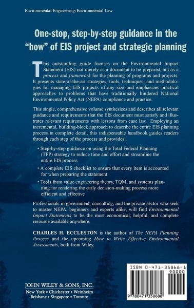 One-stop, step-by-step guidance in the "how" of EIS project and strategic planning This outstanding guide focuses on the Environmental Impact Statement (EIS) not merely as a document to be prepared, but as a process and framework for the planning of programs and projects. It presents state-of-the-art strategies, tools, techniques, and methodologies for managing EIS projects of any size and emphasizes practical approaches to problems that have traditionally hindered National Environmental Policy Act (NEPA) compliance and practice. This single, comprehensive volume synthesizes and describes all relevant guidance and requirements that the EIS document must satisfy and illustrates relevant requirements with lessons from case law. Employing an incremental, building-block approach to describe the entire EIS planning process in complete detail, this indispensable handbook guides readers through each step of the process and provides: * Step-by-step guidance on using the Total Federal Planning (TFP) strategy to reduce time and effort and streamline the entire EIS process * A complete EIS checklist to ensure that every item is accounted for when preparing the statement * Tools from value engineering theory, TQM, and systems planning for rendering the early decision-making process more efficient and effective Professionals in government, consulting, and the private sector who seek to master NEPA, beginners and experts alike, will find Environmental Impact Statements to be the most economical, helpful, and complete resource available anywhere.