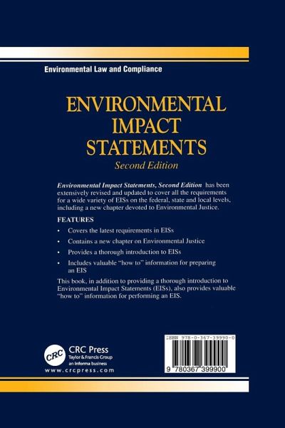 Extensively revised and updated, Environmental Impact Statements, Second Edition covers all the requirements for a wide variety of Environmental Impact Statements (EIS) on the federal, state, and local levels, including a chapter devoted to Environmental Justice.